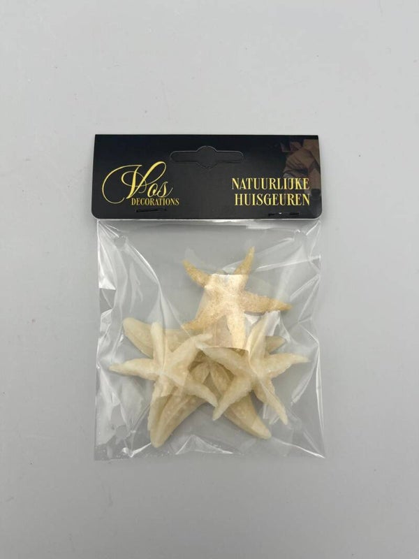 Een zakje met 1 grote zeester van 8 cm breed en 3 kleine van 4 cm. Met frisse zomerse geur.