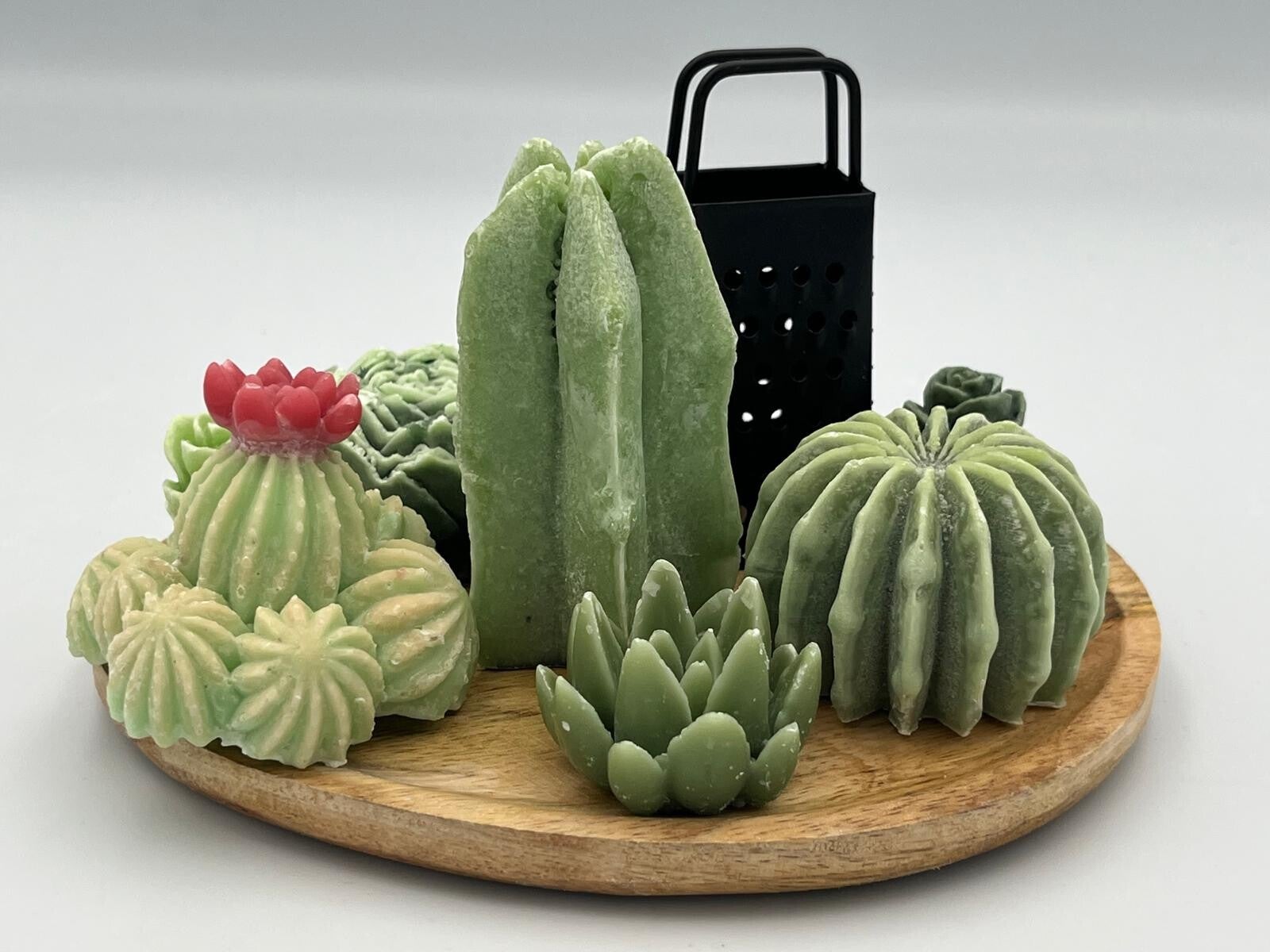 Houten bordje met een aantal verschillende cactussen en vetplantjes. Tevens met zwart raspje.